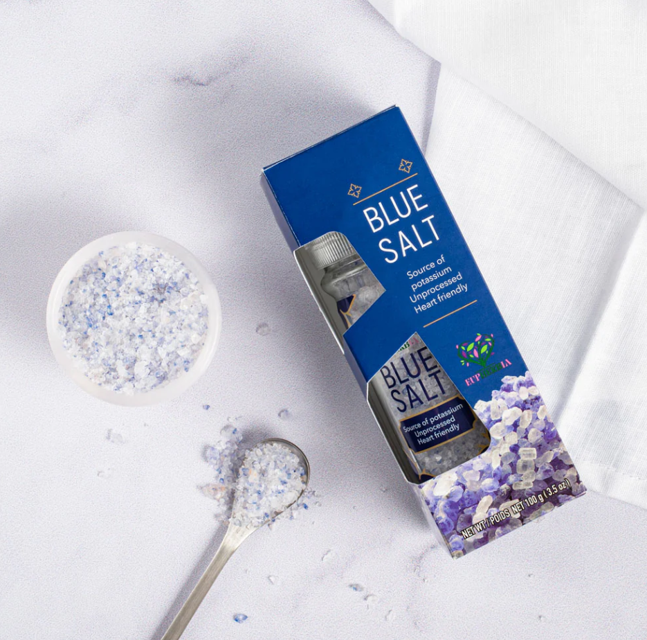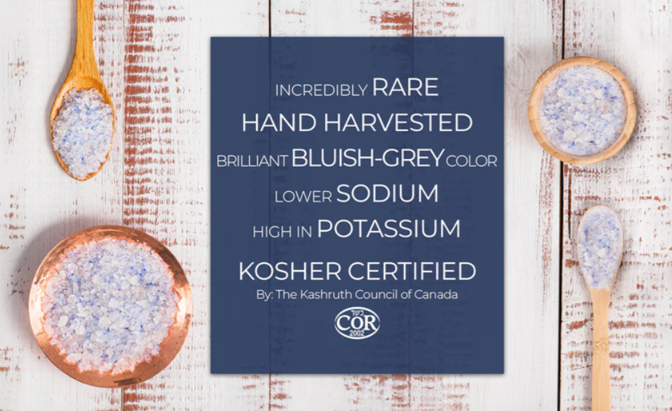 Blue salt, hand-harvested from ancient dried seas, is considered one of the rarest salts in the world. This mineral-rich alternative to table salt is high in potassium and lower in sodium. With a uniquely bold taste and a blueish-grey color, it is a popular choice to elevate dishes or to be used as a garnish.