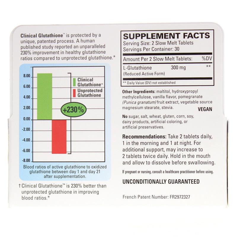 Featuring a unique, patented Slow Melt tablet, Clinical Glutathione was shown in a published, human study to achieve an unparalleled 230% improvement in healthy glutathione ratios compared to unprotected glutathione.*