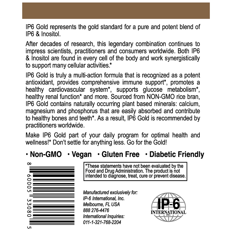 IP6 Gold is rich in bone building nutrients: Calcium, Magnesium and Phosphorus. It appears that IP6 may act as a carrier ensuring proper assimilation versus traditional mineral supplements.
