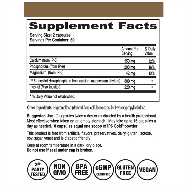Ingredients: IP-6 (from Calcium Magnesium Phytate), Inositol, Hypromellose Capsule, and Hydroxypropylcellulose.