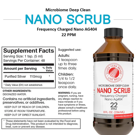Not all silver is the same, so it’s important to look at the Methods section of each scientific study in question to see what kind of silver is being investigated. The fact is that most silver types (ionic silver and silver nitrate) may not be good for you.  The frequency-activated nano AG404 in Nano Scrub is scientifically tested and proven to be safe and effective. Furthermore, most silver products only have a single- strike action, requiring a dosing that may be unsafe to use to have much of an impact on the microbiome.  Nano Scrub uses a silver that has been scientifically proven to be very effective in small amounts that easily exit the body.  Meaning, Nano Scrub is NOT limited to a single-strike action and or single mode of action. It can continuously strike throughout the entire body.  This makes it a lot more effective.