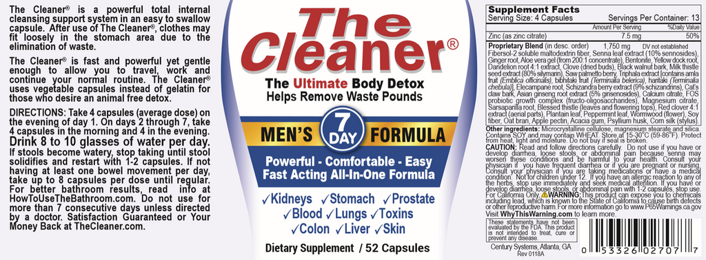 The Cleaner - 7 Day Detox for Men - 52 Vegetarian Capsules - Century Systems